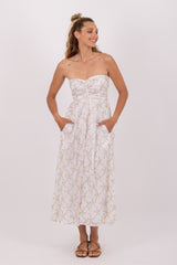 Embroidered by sequins that form shiny starfish, Amelie is a bustier dress. Slightly sweat-heart, the bustier has a smocked back and two pockets.