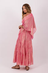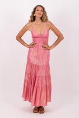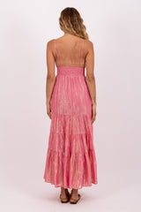 Entirely adorned by shiny threads, Ditta is defined by an open back and a lingerie style top which can be adjusted thanks to adjustable straps. A smock at the waist adjusts the dress at your shape. Made up with four gathered yokes, the flared dress bottom offers a sublime fall.