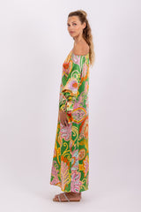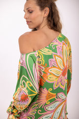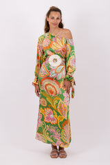 In a flowery and colorful print that was imagined and developed by our designer, Eloise is a long and asymmetric dress with flared sleeves tightened at the cuffs. This shift dress has separate links which bring fancy touch on the sleeves, and a separate belt embellished by a big raffia ring can be tied at your waist.
