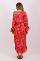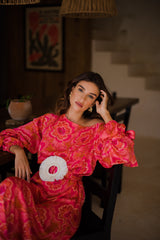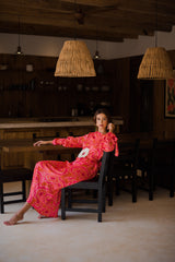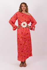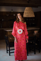 In a flowery and colorful print that was imagined and developed by our designer, Eloise is a long and asymmetric dress with flared sleeves tightened at the cuffs. This shift dress has separate links which bring fancy touch on the sleeves, and a separate belt embellished by a big raffia ring can be tied at your waist.