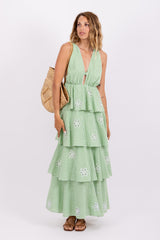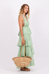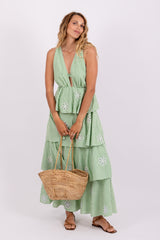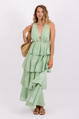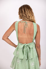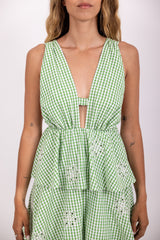 Made in a gingham fabric, Emilienne has a plunging V neckline and a very indented armhole. Straps become adjusted link on the back and adorn the backless. The bottom is made up of series of gathered flounces prettily adorned by cut out and white topstitching.