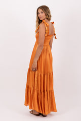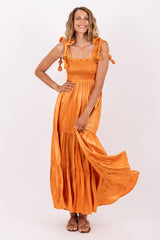 Made in a shiny fabric, Jade is defined by a smocked top and a flared bottom. Links embellished by pearls on extremities can be tied on the shoulders and sublime the piece. The skirt of the dress is defined by three gathered parts. Slit in the middle, this dress brings lightness to movements and subtly discloses the legs.