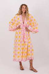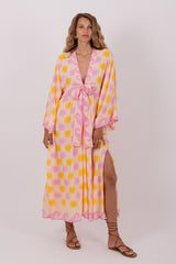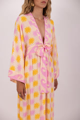 Made in an exclusive flowery Sundress print, Janis is a long and flared dress with kimono sleeves. It has a plunging V neckline and an integrated belt adorned by a knot. Slit on each side, the dress is synonym of lightness.