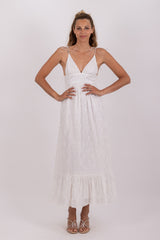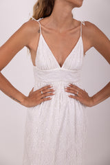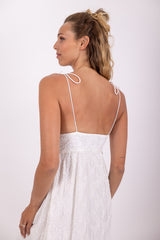 Made in embroidered fabric on which details are highlighted by sequins, Louve dress is defined by an open back and a lingerie style top which can be adjusted on the shoulders thanks to spaghetti links. The bottom is adorned by a light gathered flounces for a sublime fall. It has an invisible slide fastener on the middle back.