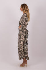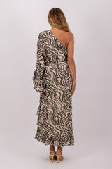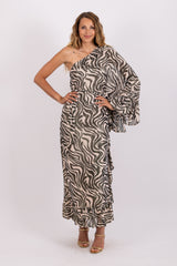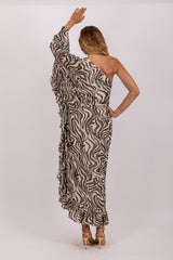 Highlighted by shiny threads, the beige and black print is inspired by feline coat. Marty is an asymmetric dress sublimed by a naked shoulder. A gathered flounce runs along the entire piece and brings lightness to movements. It has an integrated lining, and a separate belt which can be tied at your waist according to your mood.