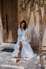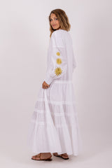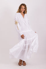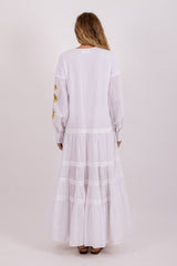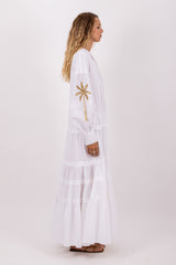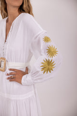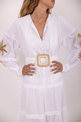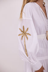 Nady is a long light dress with a neckline tie closure prettily embellished by a buttonhole. The skirt of the dress is defined by five gathered parts adorned by knife pleats that bring lightness to movements. Sleeves are tightened with a shirt cuff and are embroidered by a palmtree and suns. Knife pleats on the chest bring a feminine touch. Adjusted by an elastic, a separate belt with a square ring can be tied at the waist according to your mood.
