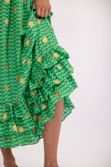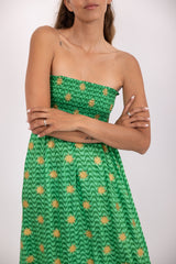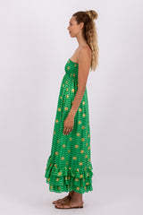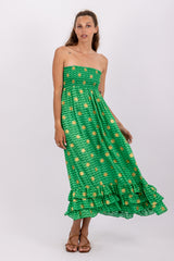 Made in an exclusive Sundress print which was imagined and developed by our designer, Pooja is a bustier dress with a  smocked top. The flared bottom is adorned by a series of gathered flounces for a sublime fall.