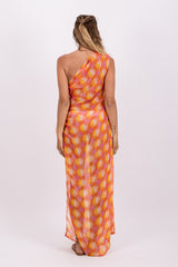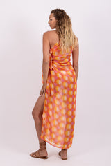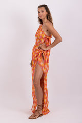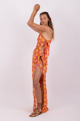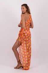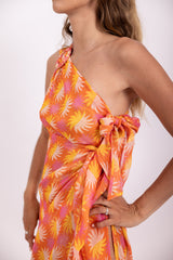 Entirely adorned by shiny threads, this flowery print is an exclusive Sundress print. Tom is an asymmetric pareo. It has a fancy ring on the shoulder and on the other side two adjustable knots. Entirely open on the side, it prettily discloses your leg.