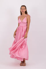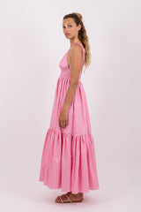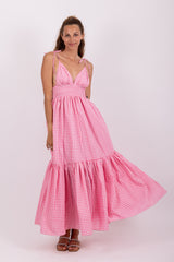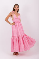 Made in pink gingham, Yolanda is defined by an open back and a lingerie style top which can be adjusted on the shoulders thanks to links. A smock at the waist adjusts the dress at your shape. Made up with two gathered yokes, the flared dress bottom offers a sublime fall.