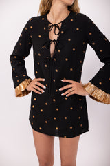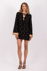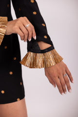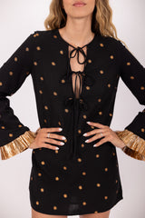 Adorned by shiny stars, Danae is a short shift dress with a plunging V neckline adorned by spaghetti links. Long sleeves are sublime by brillant fringes which are removable for an easier care.