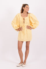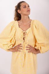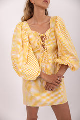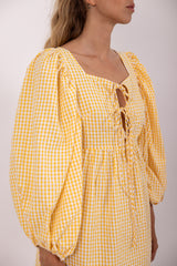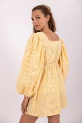 Lois is a gingham dress with flared sleeves tightened at the cuff thanks to an elastic. The square neckline has a keyhole tied closure that can be adjusted according to your mood.
