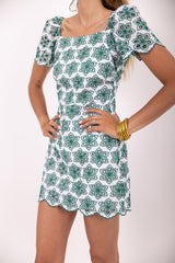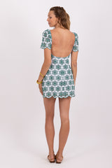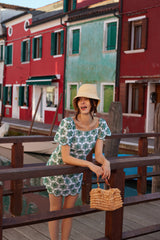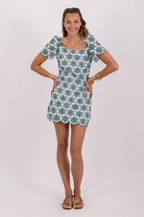 Sublime by shiny threads, the flowery print was imagined and developed by our designer. Mina is the perfect short summer dress. It has a square neckline and baby doll sleeves. Adjusted, this dress has a rounded open back.