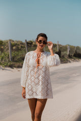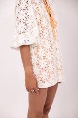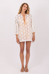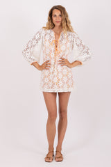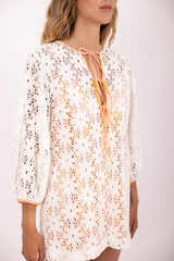 Entirely made in eyelet, Nody is a short flared dress with long sleeves tightened at the cuff for more volume. The slit on the neckline is adorned by adjustable spaghetti links. For a fancy touch, details as well as the separate lining are made in a tie and dye fabric.