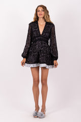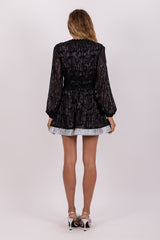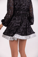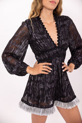 Odette is a short dress made in a shiny fabric. It has an adjusted top highlighted by a V neckline and a gathered waist embellished by ric rac. The flared bottom brings lightness to movements and it is embellished by shiny fringes which are removable for an easier care. This dress is perfect for all occasions.