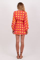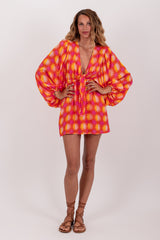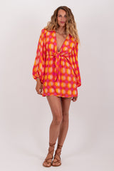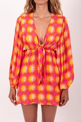 Made in a flowery exclusive Sundress print, Sia is a light dress with a plunging V neckline adorned by a tie. Very flared sleeves are tightened at the cuff for more volume. It is elasticated to highlight the waist.