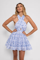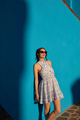 Realized in eyelet highlighted by a blue topstiching, Suzy dress has two yokes crossed on the chest, joined on the back and create a sophisticated open back. Very flared, the light bottom has seven gathered yokes which offer a sublime fall. An elastic allows to adjust the dress at your waist. This dress is synonym of lightness.
