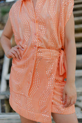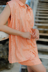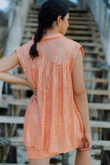 Made in a delicate embroidered fabric with subtle geometric patterns that shimmer beautifully under the sun, Assia blouse with Ezia skirt is an iconic effortless set. This shirt can also be worn in a more casual way on a swimsuit.