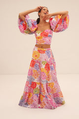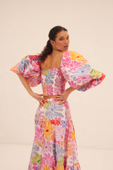 Emilia top is a bustier top with baby-doll sleeves which can be worn on or under the shoulders. Slightly sweat-heart, the bustier has a smocked back and little flounces on the front. Opt for a total look with Odette skirt. This floral set is synonym of feminity.