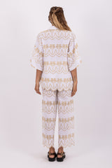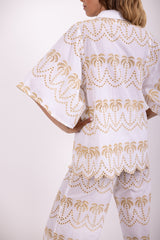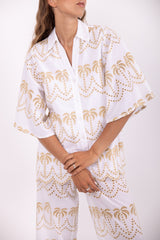 Made in eyelet palmtrees sublime by a golden topstitching, Lupy shirt have flared midi sleeves. Opt for a total look with Lupy pant.