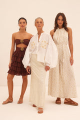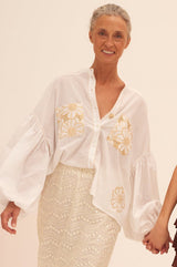 Every day essential full of handmade gold details. Stacy blouse is a flared shirt featuring by voluminous balloon sleeves.