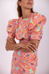 Entirely made in an exclusive and flowery print, Yvette is a babydoll crop top. It has a tie neckline closure and juliet sleeves. Opt for a total look with Yvette top.