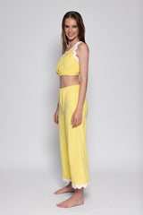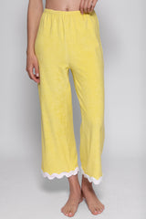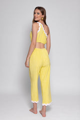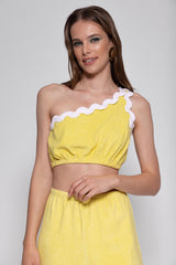 Realized in terry fabric adorned by colorful rickracks, Jordan set is made up of asymmetric crop top elasticated at the bottom which creates little gathers. The pant has a shift fit and can be adjusted at the waist thanks to an elastic.