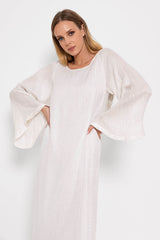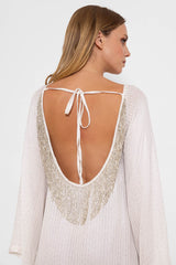 Made in a fabric prettily highlighted by silver sequins lines and shiny yarns, discover our long version of our emblematic dress Indiana. Sightly trapeze this dress has a rounded open back nicely adorned by pendants made up of shiny sequins. The raglan sleeves are flared and bring lightness to the dress. A separate belt can be tied at the waist according to your mood.