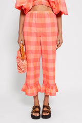 Amalia is a shift pant prettily adorned by gathered flounces at the bottom. An elastic allows to adjust the pant at your waist. Opt for a total look with Alicia top.