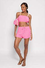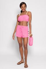 Realized in terry fabric, Ivana short has a drawsting link at the waist. Slit are entirely adorned by white shells which brings originality to your look. Opt for a total look with Ivana top.