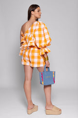 Janina is a flared short with an elastic and link at the waist.  It has two italian pockets adorned by rickracks. Opt for a total look with Constance top.