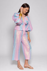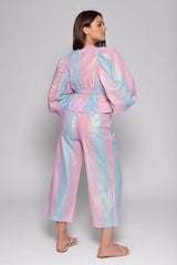 In a pink and blue tie and dye adorned by shiny yarns, Jordan pant has a shift fit and is adjusted at the waist thanks to an elastic. Opt for a total look with Alicia top.