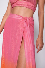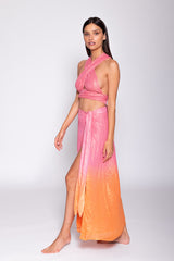 Embellished by shiny yarns, Ouma is a long skirt entirely slit on the side. Realized in a pink and orange tie and dye, this light skirt can be tied on the side thans to links and a buttonhole. Opt for the total look with Amy crop top.