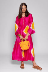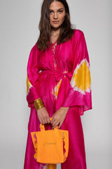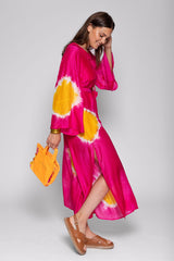Denise jumpsuit is made in a very light and fowing fabric adorned by a yellow and pink tie and dye. Its very plunging V neckline is adorned by corsage made in spaghetti links. An invisible slide fastener is located on the middle back. Slit on each side, this long jumpsuit prettily discloses your legs and brings lightness to movements. A separate belt can be tied at your waist according to your mood.