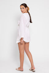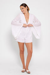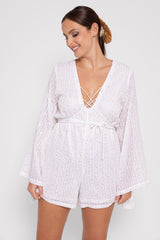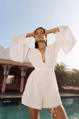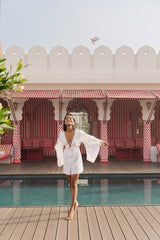 Adorned by shiny sequins, Jessica has a plunging V neckline adorned by spaghetti links that can be tied in different ways and adorned the waist. Long sleeves are very flared and bring lightness to movements. It has an invisible zipper on the middle back.
