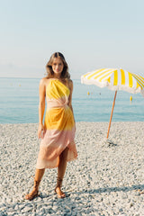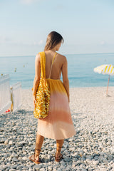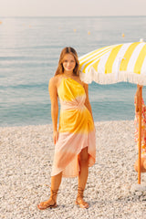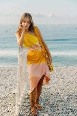 Made in a tie and dye cotton fabric, Celia is an asymmetric dress with a draped effect. Spaghetti links on a side run along the open back. Slit on the side, the petal skirt of the dress discloses your legs and brings lightness to movements.