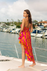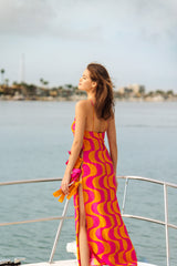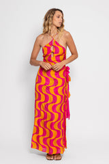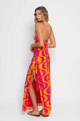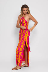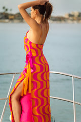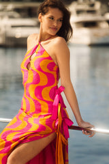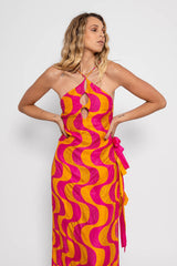 Made in a bicolor fabric on which spirals are prettily highlighted by rhinestones, Maelys is a sleeveless dress with an open back. This long dress has spaghetti links and three cut outs on the neckline. It has a very indented slit on a side prettily adorned by four knots for a feminine and sexy touch.