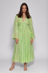 Sublime by shiny threads, Maud is a long dress with a plunging V neckline. Very flared, the sleeves and the bottom bring lightness to movements. An elastic on the back creates little gathers and allows to adjust the dress.