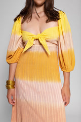 Made in a tie and dye mix peach, this bustier dress has flared sleeves tightened by an elastic on extremities. Sweat-heart, the bustier has a smocked back and a knot on the front for a fancy touch.