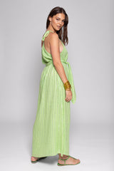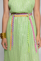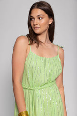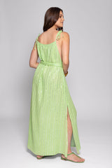 Entirely adorned by silver yarns, Solenne dress is made in a very light and fluent fabric made in havana print which was imagined and developed by our designer. It has adjustable links that can be tied on the shoulders. The dress can be worn asymmetrically according to your mood. A separate belt in the same fabric can adjust your waist according to your mood. Opt for the pictured look with Louna belt.