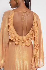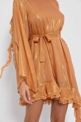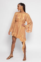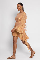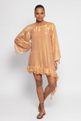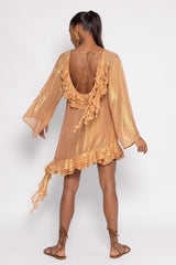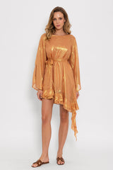 Made in a fabric prettily highlighted by shiny yarns, Indy short dress is a signature Sundress style. Sightly trapeze this dress has a rounded open back nicely adorned by series of gathered flouces. The raglan sleeves are flared and bring lightness to the dress. Three gathered flounces at the hemline runs along the dress and brings a beautiful feminine touch. The separate belt highlights the waist according to your mood.