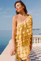 Entirely embroidered by shiny yarns, this asymmetric dress is made up of gathered flounces. Links on the shoulder allows to adjust the dress. This dress is synonym of lightness.