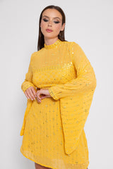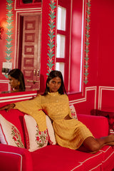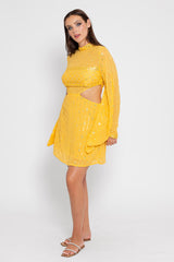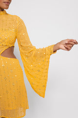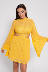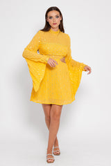 Made in an embroidered fabric adorned by sequins that catch the light, Mariana is a dress with a mock turtleneck and two cut outs on the sides which prettily reveal your waist. Very flared, long sleeves are tightened at the cuff thanks to a shirt cuff. It has an invisible zipper on the middle back.