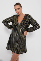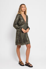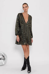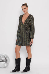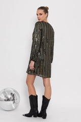 Chicka is a short dress with long sleeves fully decorated of sequins. This V neckline makes it the perfect feminine and glamourous dress ! The straight cut adapts perfectly to your silhouette by sublimating it.