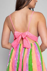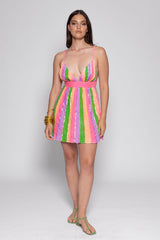 All adorned by colorful stripes and sequins, Elia is a summer dress with a lingerie-style top which offers a plunging V neckline. Slender straps are joined on the back that creates an original open back adjustable thanks to a knot. The flared bottom has an elastic on the back which creates little gathers.