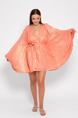 Elina is a caftan dress made in a fabric prettily adorned by shiny yarns. Batwing sleeves are tightened at the cuff by an elastic. It is sublime by a plunging V neckline and a deeper neckline on the back that can be adjusted thanks to links. A separate included belt highlights the waist according to your mood.