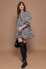 Inaya is a short and very flared dress with a V slit neckline. Voluminous sleeves are tightened at the cuffs with an elastic. A separate belt can be tied at your waist according to your mood.