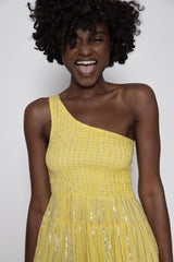 Entirely adorned by silver yarns, Joe has an asymmetric top entirely made in smock. For a unique volume, gathered parts run along the flared bottom and bring lightness to movements.
