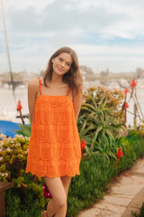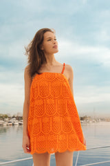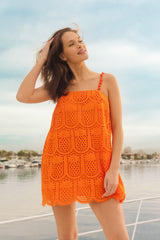 Realized in pineapple eyelet, Karla is a short summer dress with a shift cut. It has a squared neckline adorned by thin straps embroidered by pearls. This short dress is the perfect summer dress.
