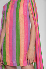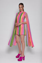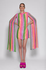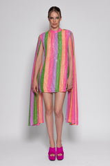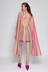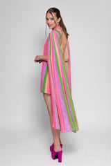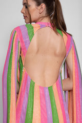 All adorned by colorful stripes and silver threads, Mahina is a shift dress with a deep open back and tie closure neckline. Long sleeves bring a fancy touch and lightness to movements.