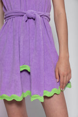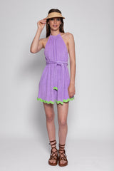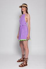 Made in colorful terry fabric adorned by colorful rickracks, Marla dress is made up of an open back and very indented armholes. This sleeveless dress has a drawstring link that can be tied behind the head and creates gathers on the front. A separate belt can be tied at the waist according to your mood.